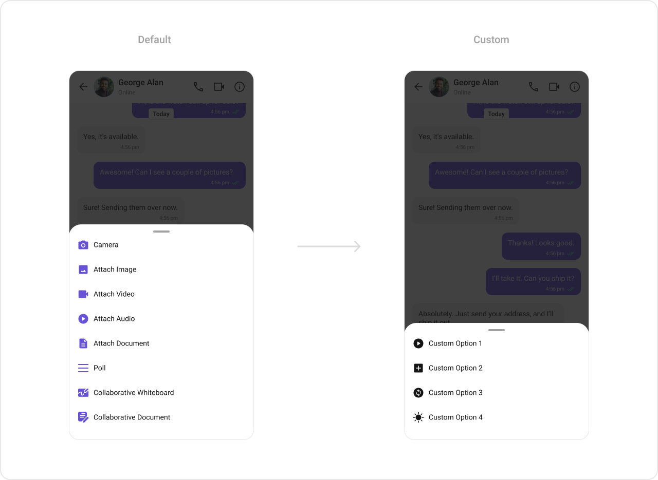 To fit your app’s design requirements, you can customize the appearance of the MessageComposer component. We provide exposed methods that allow you to modify the experience and behavior according to your specific needs.