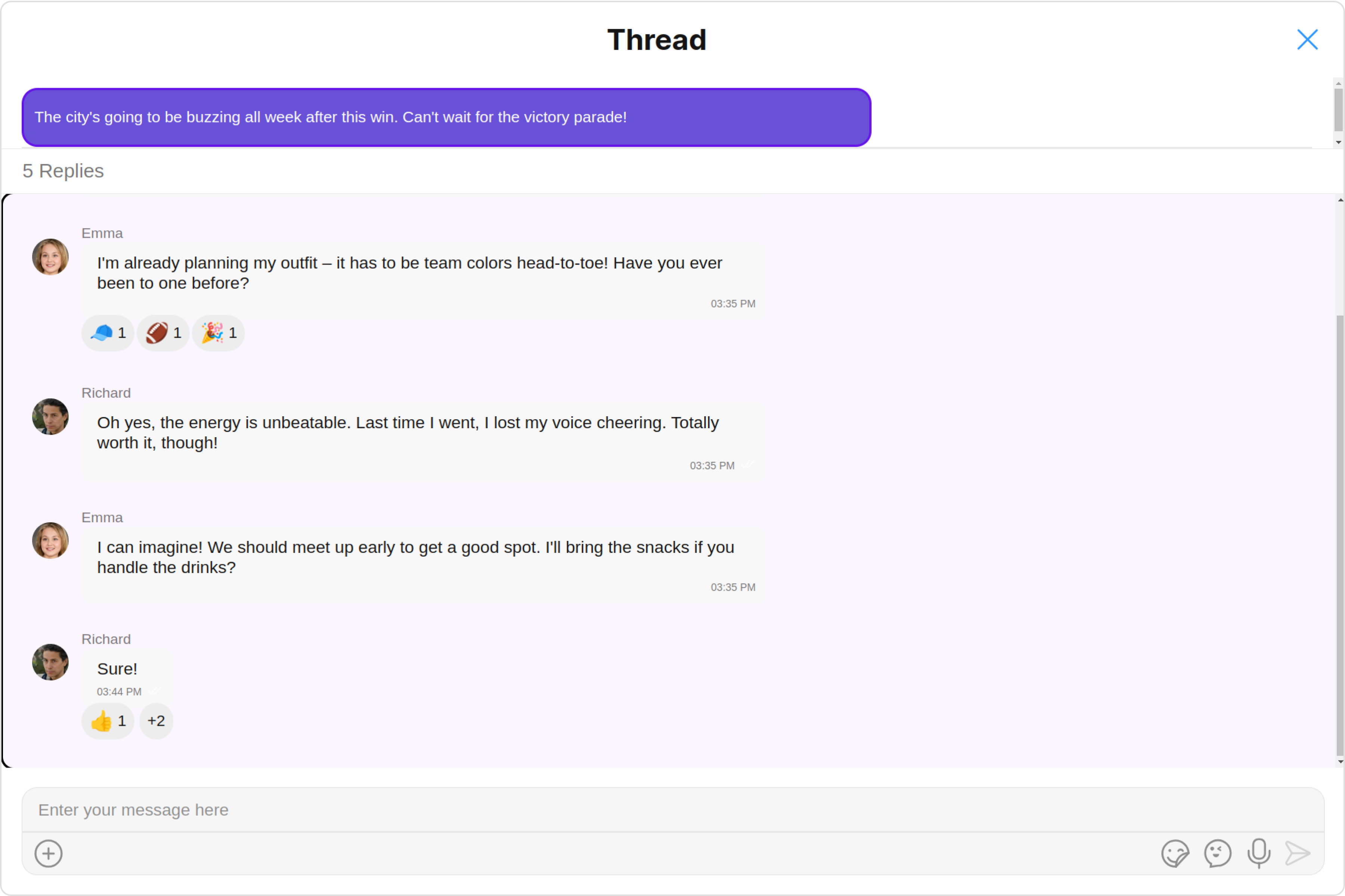 ThreadedMessages is a Composite Component that displays all replies made to a particular message in a conversation. By default, the parent message will be displayed at the top, the message composer will be at the bottom and between them a message list will contain all replies.